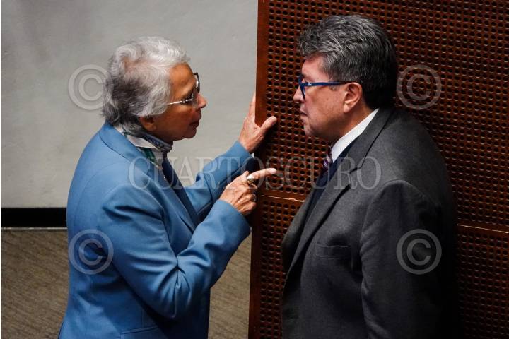 Olga Sánchez Cordero, presidenta del Senado, conversa con Ricardo Monreal, presidente de la JUCOPO, durante la sesión del Senado de la Republica que probó la modificación de la ley de Seguros y Pólizas para evitar la discriminación a personas con di
