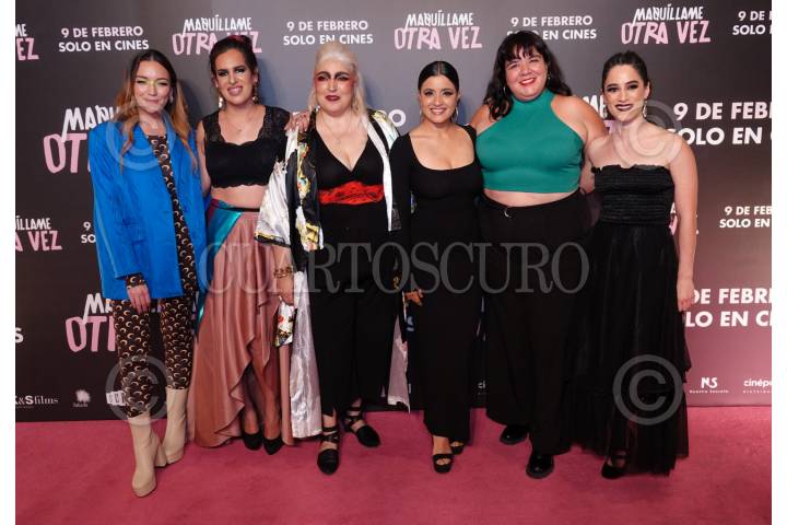 Las actrices Regina Blandón, Eliza Sonrisas, Martha Claudia Moreno, Paulina Gaitán, y Tamara Vallarta durante la Alfombra Roja de la película Maquíllame otra vez en Cinépolis Miyana