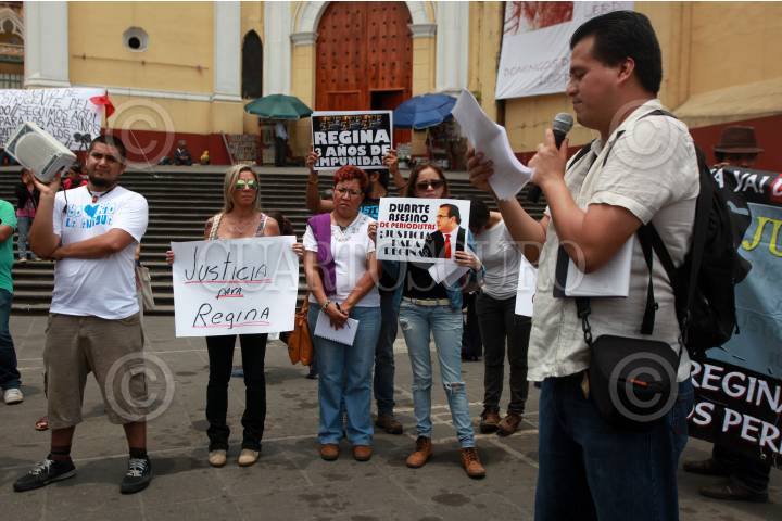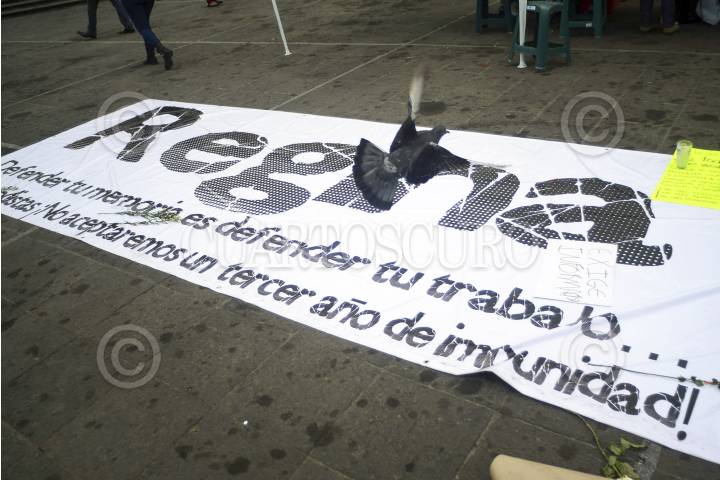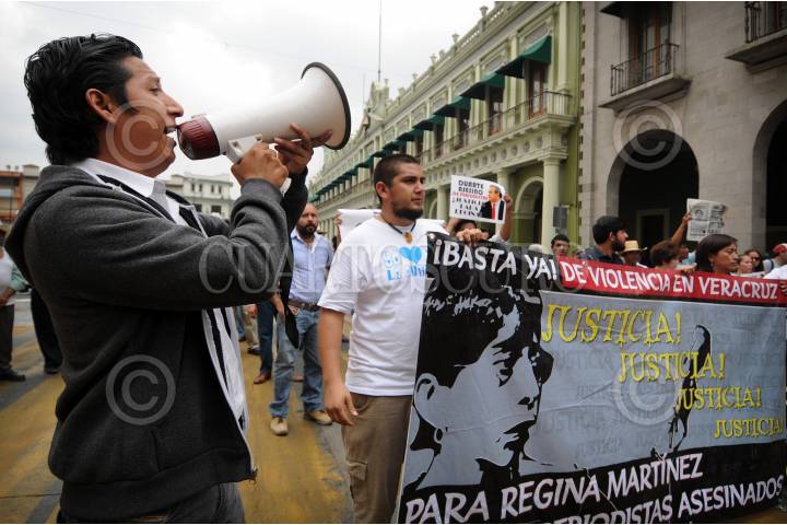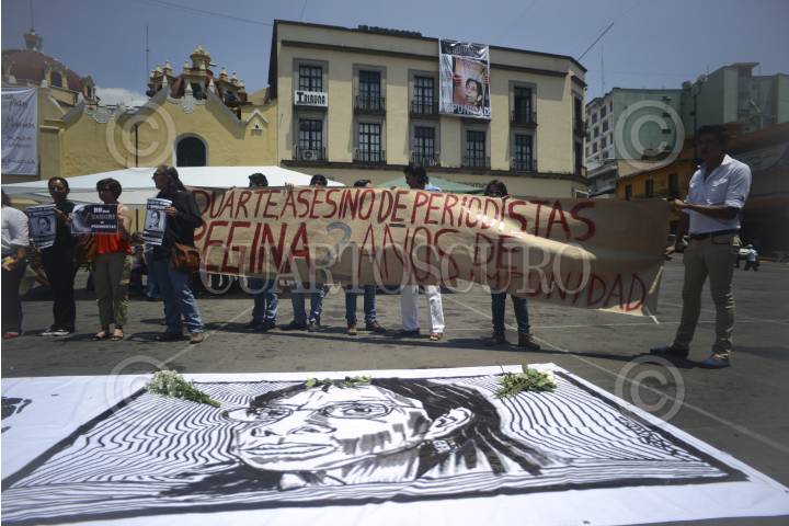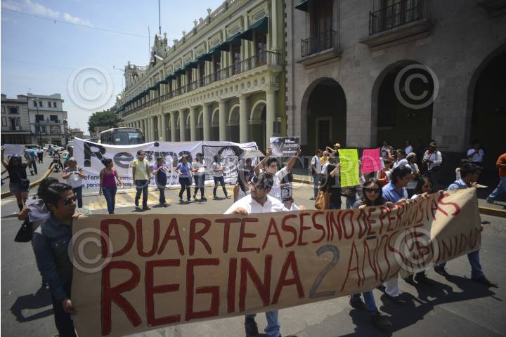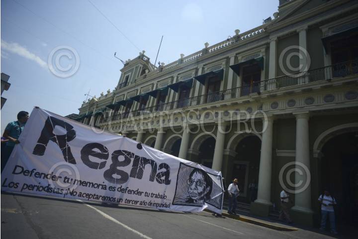 XALAPA, VERACRUZ, 28ABRIL2014.- Con motivo del segundo año de impunidad sobre el asesinato de la corresponsal de la revista Proceso en Veracruz, Regina Martínez; Periodistas y Organizaciones civiles marcharon para exigir justicia al gobierno de Javier Duarte, alrededor del Palacio de Gobierno y de las instalaciones de la SSP con pancartas y una enorme lona que mostraba el rostro de Regina y en donde se leía: : "Regina, defender tu memoria es defender tu trabajo. Los periodistas ¡no aceptaremos un tercer año de impunidad!”. FOTO: RUBÉN ESPINOSA /CUARTOSCURO.COM