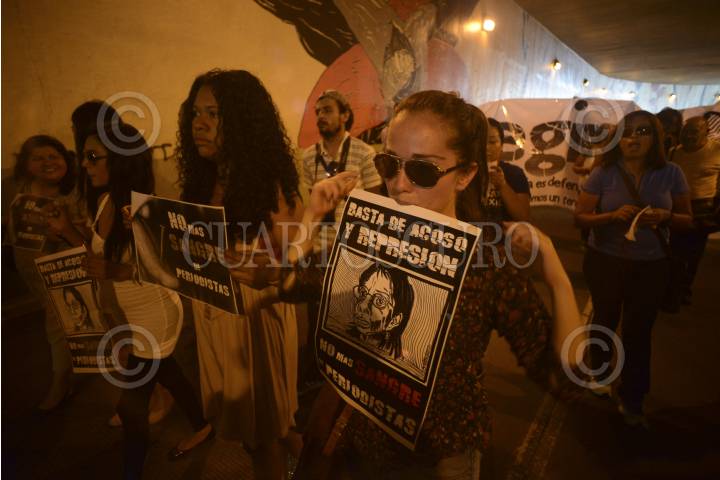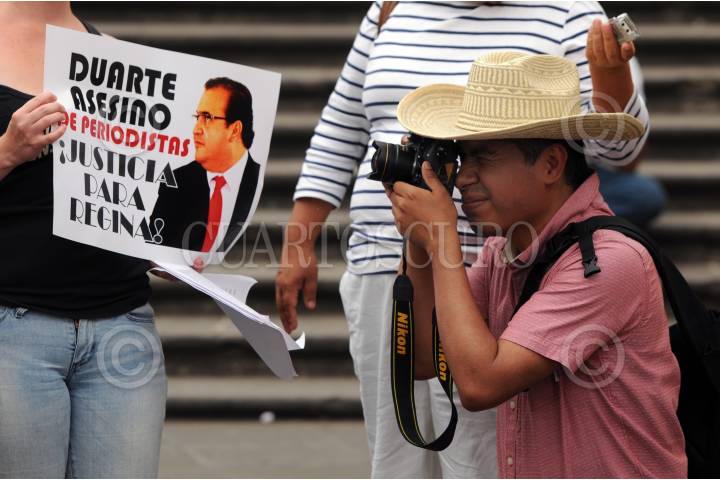XALAPA, VERACRUZ, 28ABRIL2015.- Un grupo de periodistas y activistas marcharon por las calles de Xalapa para conmemorar el tercer aniversario del asesinato de la periodista Regina Martínez. Los manifestantes exigieron justicia y pidieron el cambio de nombre de la actual Plaza Sebastian Lerdo por el de la comunicadora fallecida. FOTO: FÉLIX MÁRQUEZ /CUARTOSCURO.COM