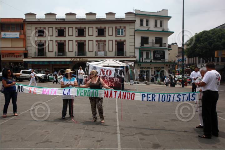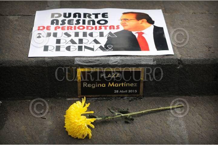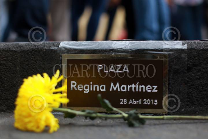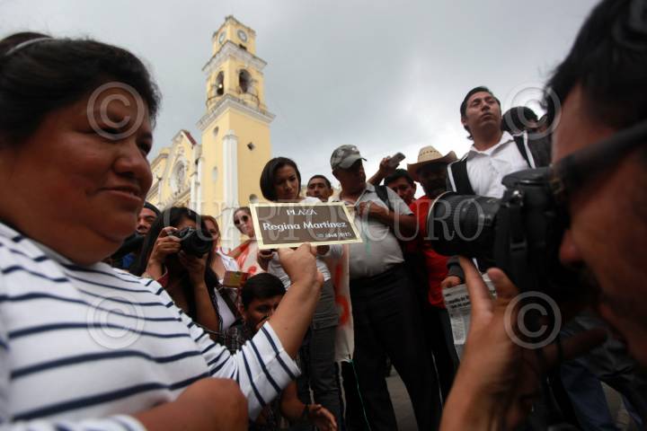 XALAPA, VERACRUZ, 09JUNIO15.- Hostigados por informantes de gobierno, periodistas de Xalapa colocaron por segunda vez en Plaza Lerdo la placa en honor a la periodista Regina Martinez, la cual ya había sido colocada el pasado el 28 de abril al cumplirse tres años del asesinato de la comunicadora y retirada el 7 de junio por desconocidos. Los periodistas recaudarán firmas para solicitar de manera formal al cabildo de Xalapa el nombramiento de Plaza Regina Martínez. FOTO: RUBÉN ESPINOSA /CUARTOSCURO.COM