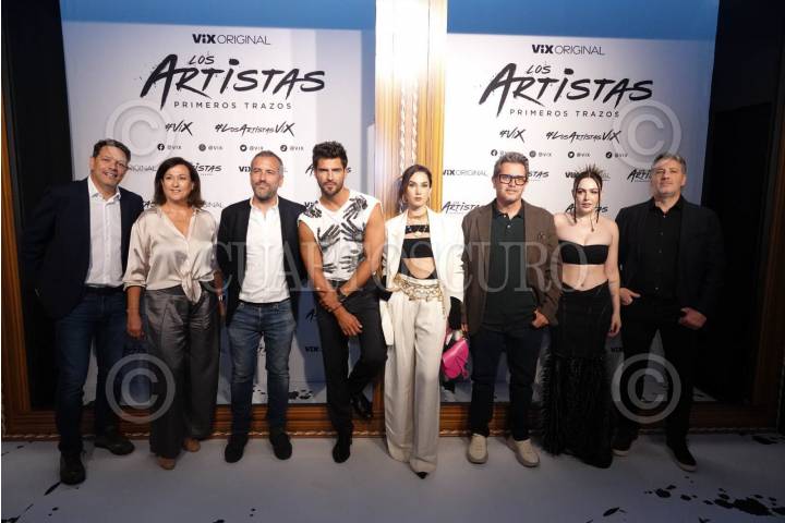Los actores Maxi Iglesias, Ximena Romo y Regina Pavón acompañados de los directores Joaquín Llamas, Oriol Ferrer y Manuel Sanarabria durante la Alfombra Roja de la serie “Los Artistas: Primeros Trazos” en Fundación Sebastián