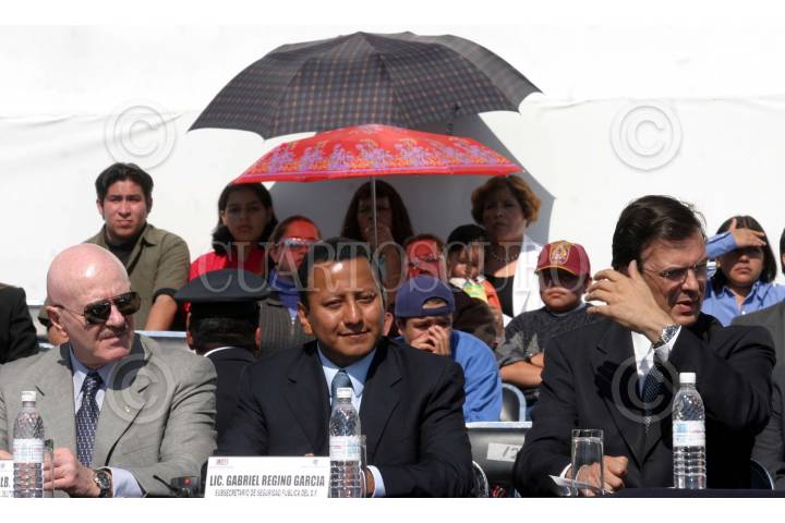 México, D.F., 13ABRIL2004.- Manuel Mondragón, Gabriel Regino, subsecretario de seguridad pública y Marcelo Ebrard, secretario de seguridad pública del DF, entregaron constancias de ascensos a policiías bancarios en el monumento de la Revolución. FOTO: Moisés Pablo/CUARTOSCURO.COM