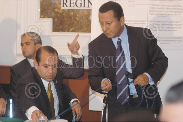 MEXICO D.F. 05 ENERO2005.- Ante los integrantes de la Comisión de Investigación del caso de San Juan Ixtayopan, el subsecretario de Seguridad Publica, Gabriel Regino, comparecio para explicar la participación de la policia preventiva. El legislador Julio Moreno Rivera libera el cable del microfono que uso el funcionario capitalino durante su exposición. FOTO: Germán Romero/CUARTOSCURO.COM