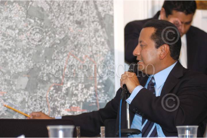 MEXICO D.F. 05 ENERO2005.- Ante los integrantes de la Comisión de Investigación del caso de San Juan Ixtayopan, el subsecretario de Seguridad Publica, Gabriel Regino, comparecio para explicar la participación de la policia preventiva. El legislador Julio Moreno Rivera libera el cable del microfono que uso el funcionario capitalino durante su exposición. El funcionario local se apoyo con un mapa para exponer su argumentos. FOTO: Germán Romero/CUARTOSCURO.COM