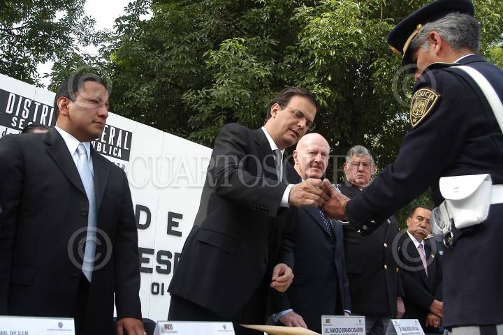 México D.F. 01 Marzo 2004.- Gabriel Regino subsecretario de la SSP, Marcelo Ebrad titular de la policia preventiva entregan un juego de esposas para ser utilizadas por los uiniformados en la detención de delicuentes peligrosos. FOTO: Germán Romero/CUARTOSCURO.COM