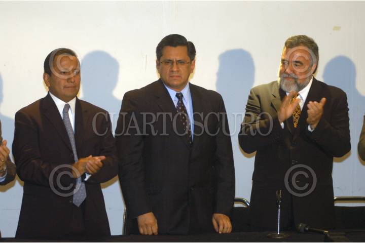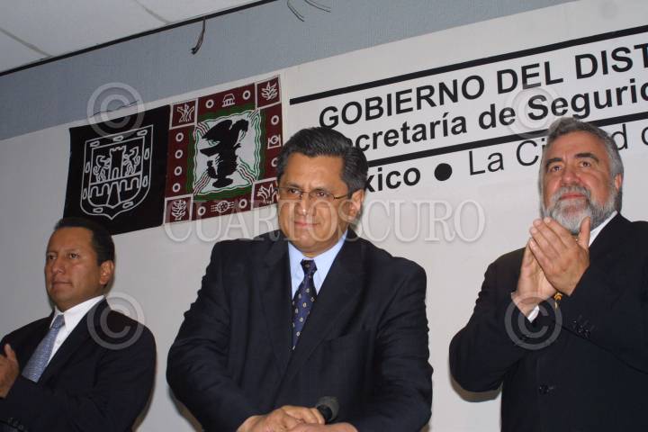 MEXICO, D.F. 13DICIEMBRE2004.- Gabriel Regino, subsecretario de seguridad pública, Joel Ortega Cuevas nuevo secretario de Seguridad Pública del Distrito Federal y Alejandro Encinas, secretario de Gobierno del D. F., durante la toma de posesión de Ortega en el auditorio del edificio de la SSP. FOTO: CUARTOSCURO.COM