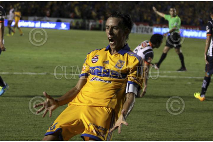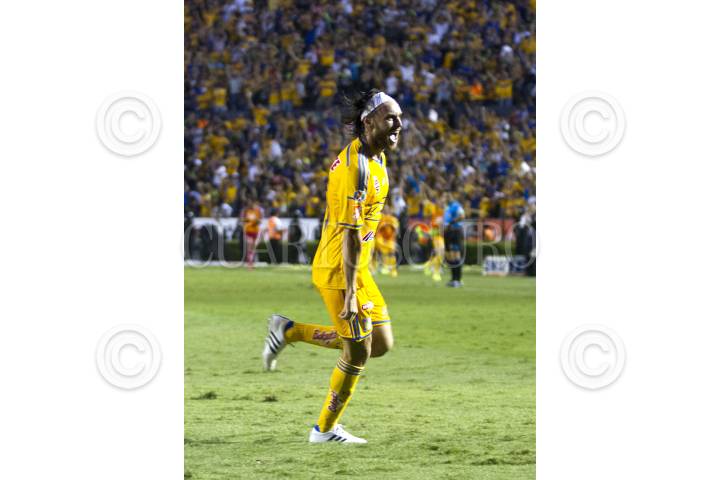SAN NICOLÁS DE LOS GARZA, NUEVO LEÓN, 18ABRIL2015.- Edgar Lugo del equipo de los Tigres de la UANL, celebra el gol durante los primeros minutos del segundo tiempo contra el equipo de los Rayados del Monterrey, en el estadio Universitario, en el clásico regio 104, partido correspondiente a la jornada 14, de la Liga MX, Clausura 2015 FOTO: GABRIELA PÉREZ MONTIEL / CUARTOSCURO.COM