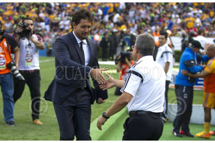 SAN NICOLÁS DE LOS GARZA, NUEVO LEÓN, 18ABRIL2015.- El Director Técnico de los Tigres de la UANL saluda a Carlos Kenny de los Rayados de Monterrey, previo al partido, en el estadio Universitario, en el clásico regio 104, partido correspondiente a la jornada 14, de la Liga MX, Clausura 2015 FOTO: GABRIELA PÉREZ MONTIEL / CUARTOSCURO.COM