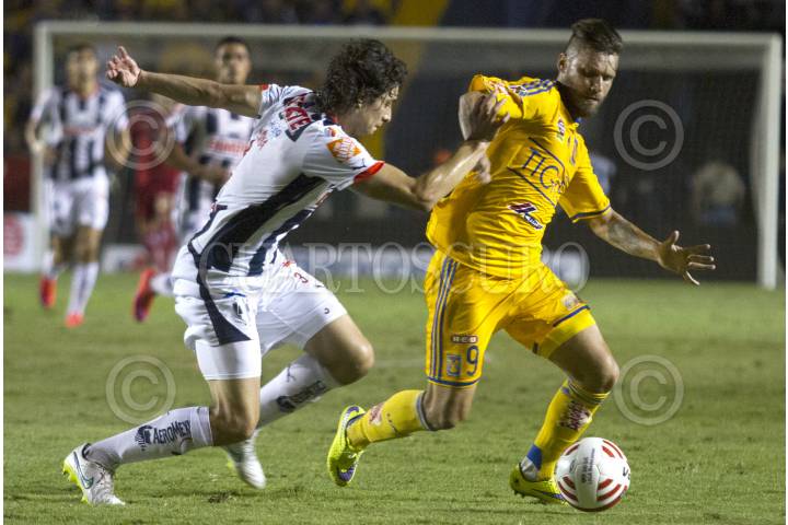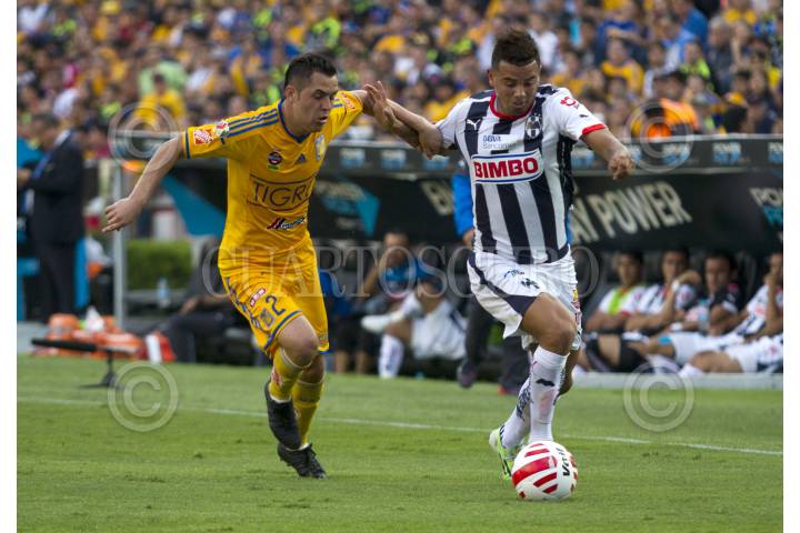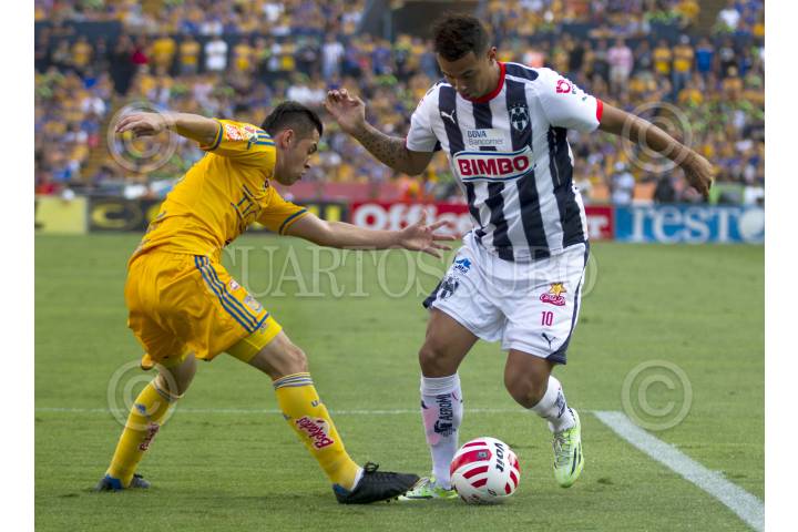 SAN NICOLÁS DE LOS GARZA, NUEVO LEÓN, 18ABRIL2015.- Israel Jiménez del equipo de los Tigres de la UANL, se disputa el balón con Edwin Cardona de los Rayados del Monterrey, en el estadio Universitario, en el clásico regio 104, partido correspondiente a la jornada 14, de la Liga MX, Clausura 2015 FOTO: GABRIELA PÉREZ MONTIEL / CUARTOSCURO.COM