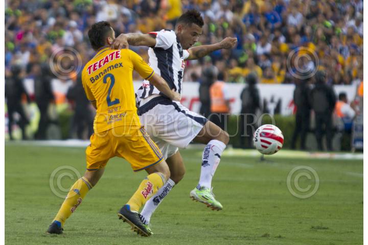 SAN NICOLÁS DE LOS GARZA, NUEVO LEÓN, 18ABRIL2015.- Stefan Medina del equipo de los Tigres de la UANL, se disputa el balón con Rafael Sobis de los Rayados del Monterrey, en el estadio Universitario, en el clásico regio 104, partido correspondiente a la jornada 14, de la Liga MX, Clausura 2015 FOTO: GABRIELA PÉREZ MONTIEL / CUARTOSCURO.COM