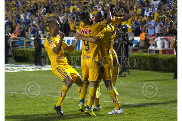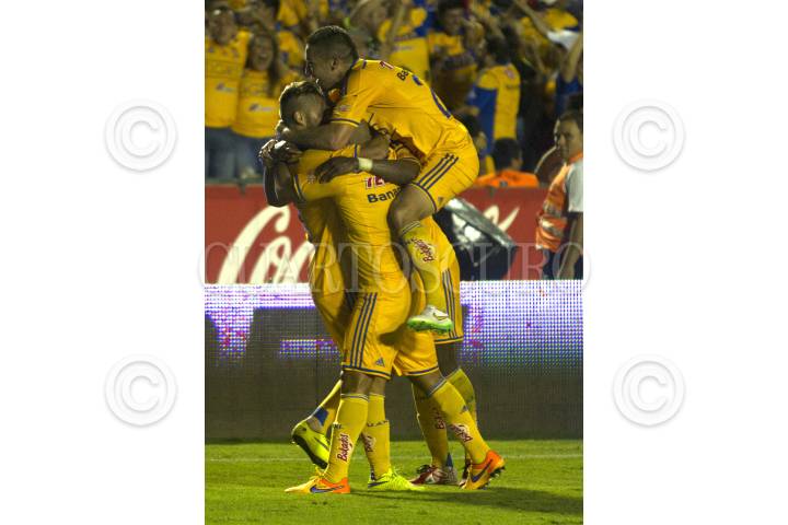 SAN NICOLÁS DE LOS GARZA, NUEVO LEÓN, 18ABRIL2015.- Jugadores del equipo de los Tigres de la UANL, celebran el segundo gol en contra del equipo de los Rayados del Monterrey, en el estadio Universitario, en el clásico regio 104, partido correspondiente a la jornada 14, de la Liga MX, Clausura 2015 FOTO: GABRIELA PÉREZ MONTIEL / CUARTOSCURO.COM