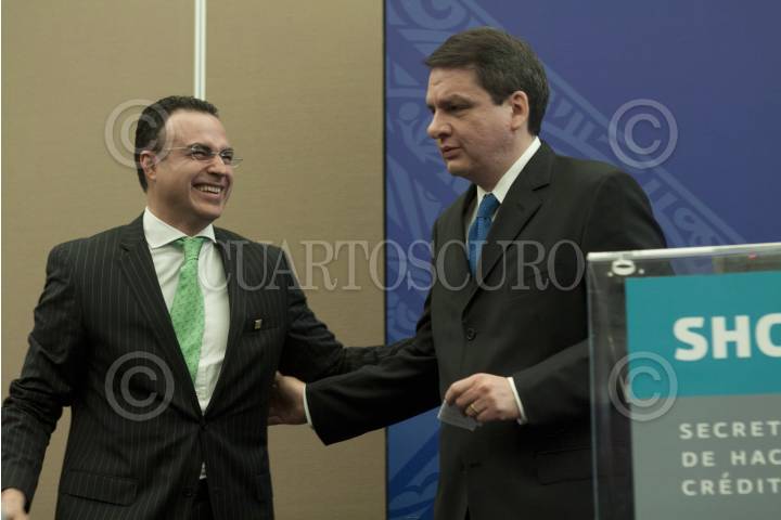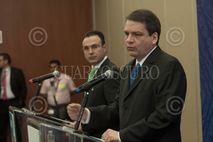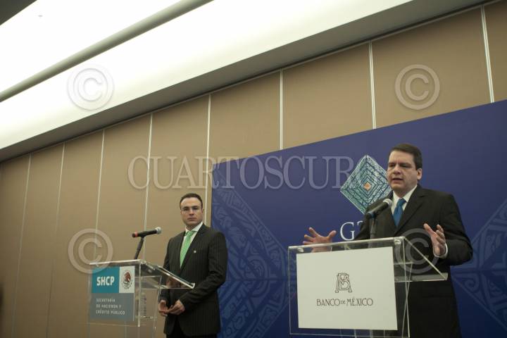 MÉXICO, D.F., 20ENERO2012.- Gerardo Rodríguez Regordosa, subsecretario de Hacienda y Crédito Público, y Manuel Ramos Francia, subgobernador del Banco de México, durante la conferencia de prensa y dar a conocer las conclusiones alcanzadas en el seminario titulado 'Reforma y Fortalecimiento de la Arquitectura Financiera' y en la primera Reunión de Viceministros de Finanzas y Subgobernadores de Bancos Centrales del G20, efectuados entre el jueves y viernes de esta semana en la Ciudad de México FOTO: MOISÉS PABLO/CUARTOSCURO.COM