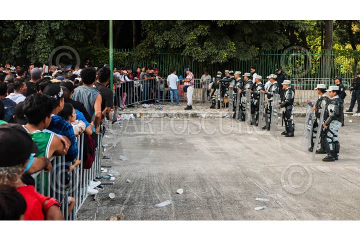 TAPACHULA, CHIAPAS. 25SEPTIEMBRE2023.- Un aproximado de 5 mil Migrantes de las distintas nacionalidades acudieron a las parque ecológico. Entre gritos y empujones los caminantes intentaban ingresar a la fuerza a las oficinas de Regularización migratoria en el parque ecológico que fue habilitado para atender los caminantes. FOTO: DAMIÁN SÁNCHEZ/CUARTOSCURO.COM