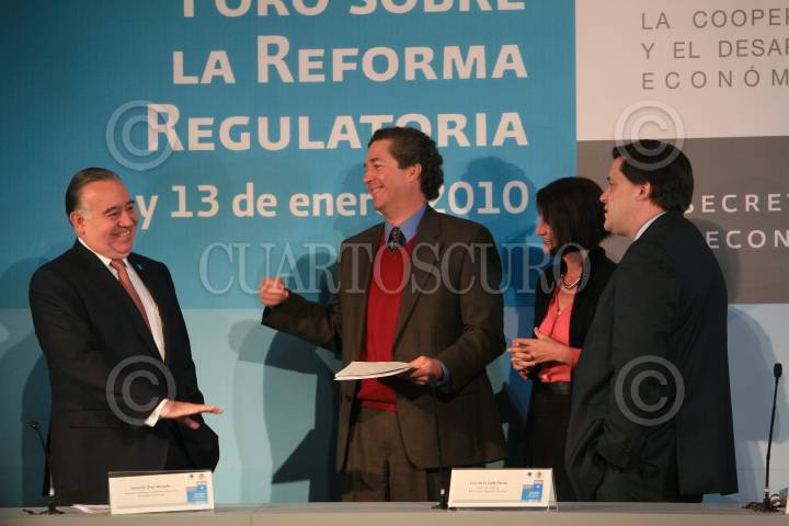 MÉXICO, D.F., 12ENERO2010.- Valentín Diez Morodo, presidente del Consejo Empresarial Mexicnao de Comercio Exterior, Luis de la Calle Pardo, director general , De la Calle, Madrazo, Mancera, Lorenza Martínez Trigueros, subsecretaria de Industria y Comercio SE y Alfredo Gutiérrez Ortiz Mena, jefe de sistema de Administración Tributaria, durante su participación en el foro sobre La Reforma Regulatoria que se organizó la Secretaría de Economía. FOTO: MOISÉS PABLO/CUARTOSCURO.COM