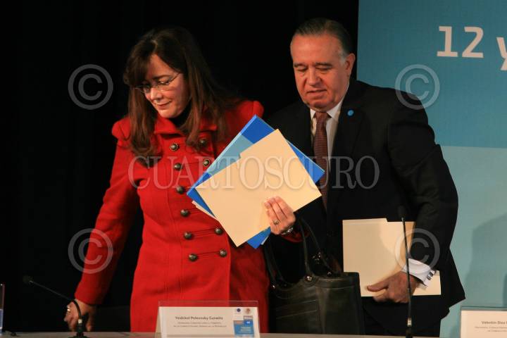MÉXICO, D.F., 12ENERO2010.- Yeidckol Polensky, integrante de la Comisión para el Fomento de la Competitividad del Senado de la República y Valentín Diez Morodo, presidente del Consejo Empresarial Mexicano de Comercio Exterior, durante su participación sobre en el foro sobre La Reforma Regulatoria que se organizó la Secretaría de Economía. FOTO: MOISÉS PABLO/CUARTOSCURO.COM