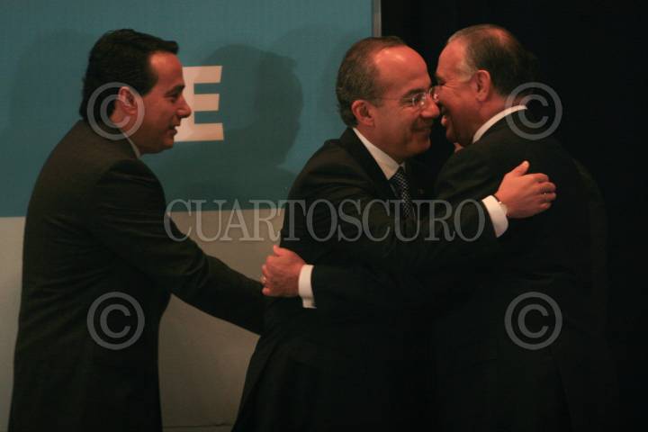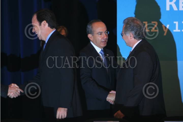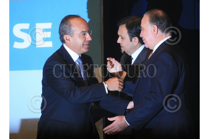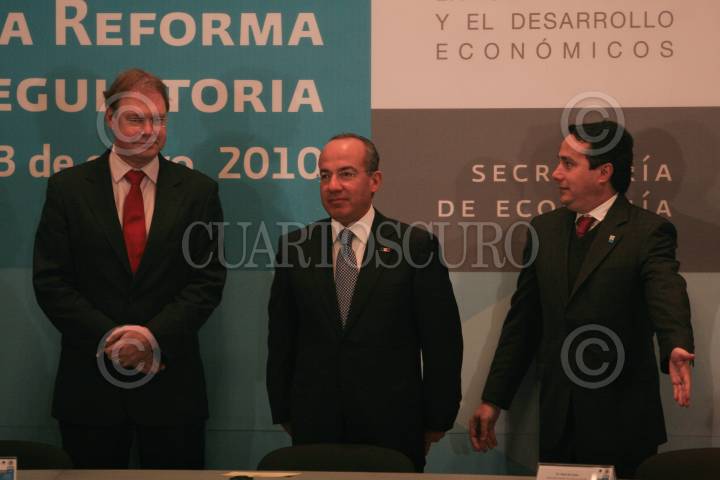 MÉXICO, D.F., 12ENERO2010.- Gerardo Ruíz Mateo, Secretario de Economía, Felipe Calderón Hinojosa, Presidente de México y Valentín Diez Morodo, presidente del Consejo Empresarial Mexicano de Comercio Exterior, durante su participación sobre en el foro sobre La Reforma Regulatoria que se organizó la Secretaría de Economía. FOTO: MOISÉS PABLO/CUARTOSCURO.COM