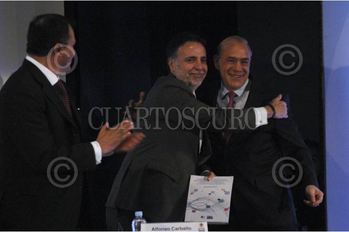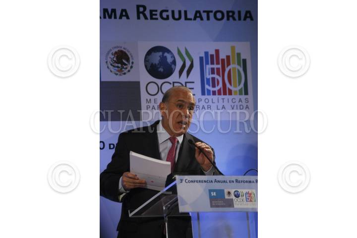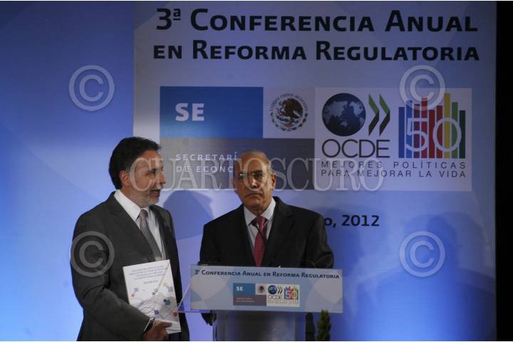 MÉXICO, D.F., 10ENERO2012.- Bruno Ferrari, titular de la Secretaría de Economía y José Ángel Gurría Presidente de la Organización para la Cooperación y el Desarrollo Económicos (OCDE), durante la inauguración de la 3era. Conferencia Anual en Reforma Regulatoria en las instalaciones de esta dependencia. FOTO: GUILLERMO PEREA/CUARTOSCURO.COM