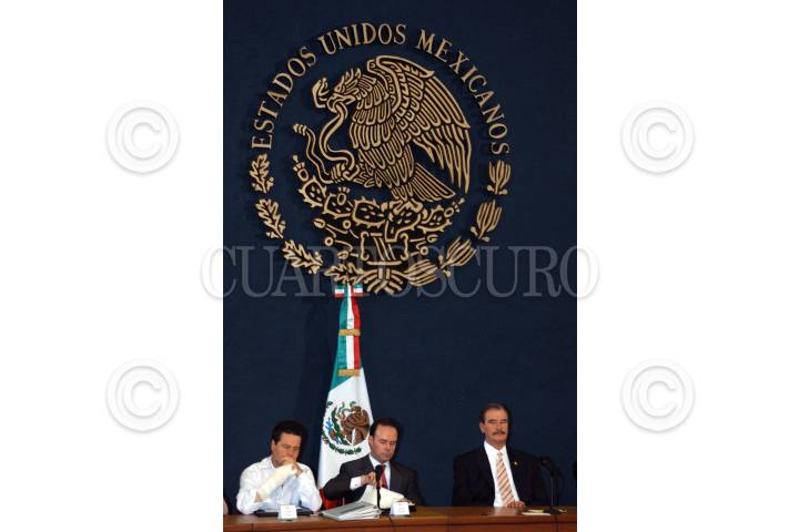 MÉXICO D.F. 29MAYO2006.- Eduardo Buorns, gobernador de Sonora, Carlos Garcia Fernández titular de la Comisión Federal de la Reforma Regulatoria y el presidente, Vicente Fox, durante la decimo segunda reunión del Consejo Federal para la Mejora Regulatoria, en la residencia oficial de los Pinos. FOTO: Guillermo Perea/ CUARTOSCURO.COM