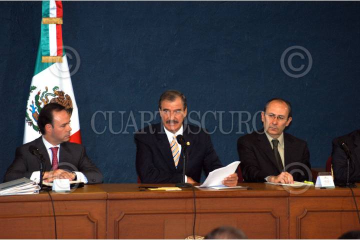 MÉXICO D.F. 29MAYO2006.- Carlos Garcia Fernández titular de la Comisión Federal de la Reforma Regulatoria, el presidente, Vicente Fox y Sergio Garcia de Alba, Secretario de Economia, durante la decimo segunda reunión del Consejo Federal para la Mejora Regulatoria, en la residencia oficial de los Pinos. FOTO: Guillermo Perea/ CUARTOSCURO.COM
