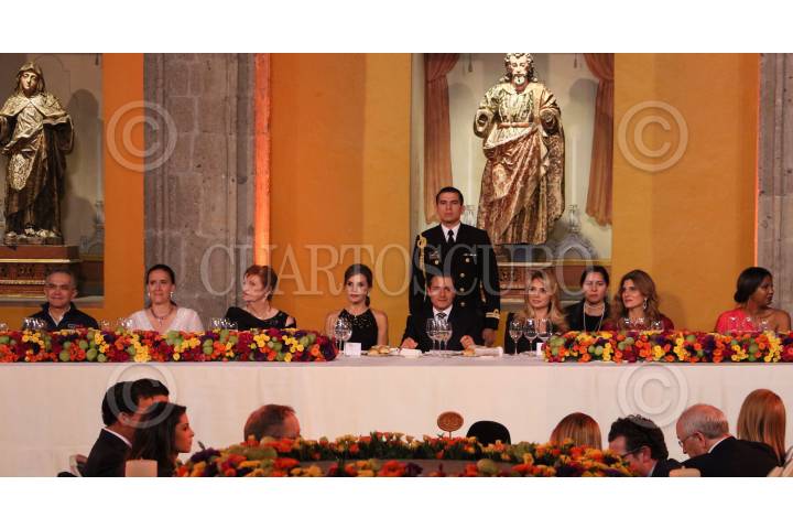 GUADALUPE, ZACATECAS, 01JULIO2015.- El gobernador de Zacatecas Miguel Alonso Raya, la Reina Letizia y su esposo el Rey Felipe VI, acompañados del Presidente de México Enrique Peña Nieto y su esposa Angélica Rivera de Peña, visitaron el Museo Virreinal de Guadalupe donde hicieron en un recorrido guiado por la directora del INAH María Teresa Franco. En este lugar conocieron el Claustro de San Francisco, la Escalera Regia, la Biblioteca Conventual y escucharon al Coro del Colegio de Guadalupe. FOTO: GOBIERNO DE ZACATECAS /CUARTOSCURO.COM