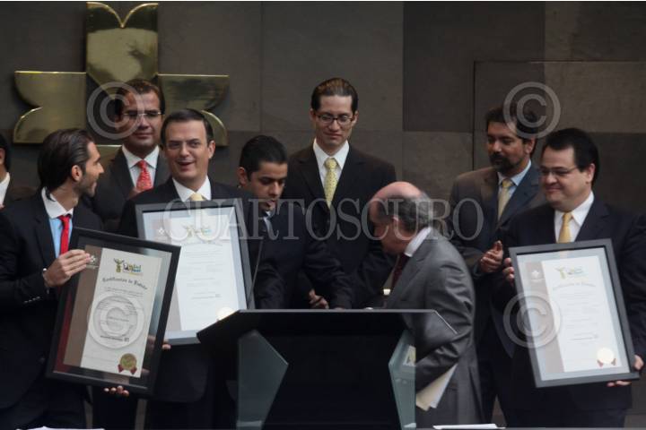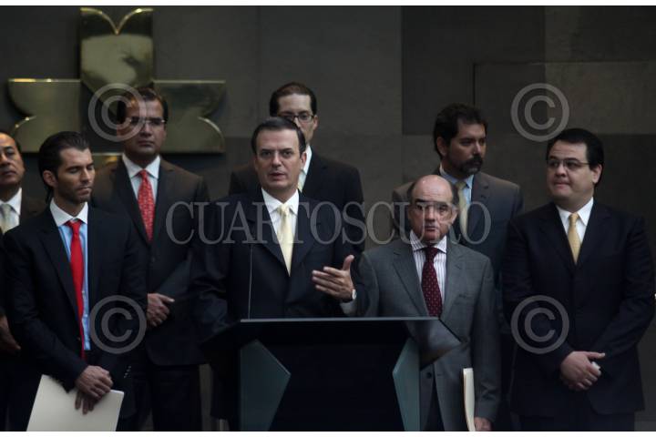 MÉXICO, D.F., 15OCTUBRE2010.- Marcelo Ebrard, jefe de gobierno del Distrito Federal acompañado de Raúl Martínez Ostos, representantes de Deutsche Bank, Luis Tellez Kuenzler, presidente de la Bolsa Mexicana de Valores y Armando Lopéz Cárdenas, secretario de Finanzas del Distrito Federal durante la colocación de Certificados Bursátiles Fiduciarios del Gobierno del Distrito Federal que se realizo en el piso de remates de la Bolsa Mexicana de Valores. FOTO: RODOLFO ANGULO/CUARTOSCURO.COM