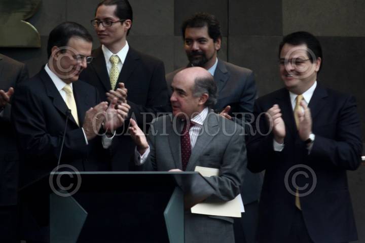 MÉXICO, D.F., 15OCTUBRE2010.- Marcelo Ebrard, jefe de gobierno del Distrito Federal; Luis Tellez Kuenzler, presidente de la Bolsa Mexicana de Valores y Armando Lopéz Cárdenas, secretario de Finanzas del Distrito Federal durante la colocación de Certificados Bursátiles Fiduciarios del Gobierno del Distrito Federal que se realizo en el piso de remates de la Bolsa Mexicana de Valores. FOTO: RODOLFO ANGULO/CUARTOSCURO.COM
