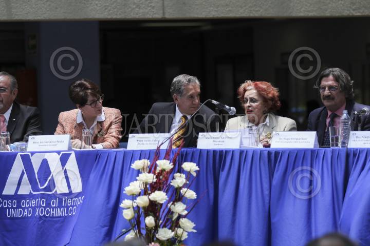 MÉXICO, D.F., 30MAYO2013.- Iris Santacruz Fabila, Secretaria General de la UAM; René Avilés Fabila, escritor, periodista y catedrático; María Luisa "La China" Mendoza, escritora; y Hugo Enrique Sáez, investigador UAM-Xochimilco; durante el homenaje en la Universidad Autónoma Metropolitana Unidad Xochimilco (UAM-Xochimilco), con motivo de sus 50 años como creador literario. FOTO: ADOLFO VALTIERRA /CUARTOSCURO.COM