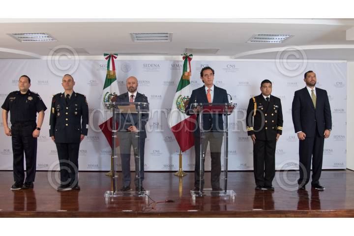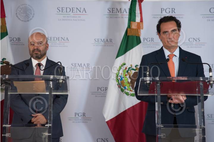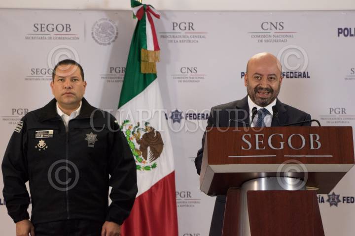 CIUDAD DE MÉXICO, 17MAYO2018.- Renato Sales, Comisionado Nacional de Seguridad, y Alberto Elías Beltrán, Subprocurador Jurídico y de Asuntos Internacionales, en suplencia del Procurador General de la República, confirmaron la detención de "El 80" en Namiquipa, Chihuahua. Se informó que elementos de élite de la Sedena y la Policía Federal capturaron a Carlos Arturo "N", se trata del principal generador de violencia en el estado de Chihuahua, esta persona era uno de los más buscados por el FBI. FOTO: DIEGO SIMÓN SÁNCHEZ /CUARTOSCURO.COM