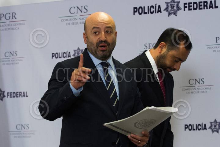 CIUDAD DE MÉXICO, 09MAYO2018.- Renato Sales Heredia, comisionado Nacional de Seguridad, acompañado de Alberto Elías Beñtrán, subprocurador Jurídico y de Asuntos Internacionales, en conferencia de prensa informaron sobre la detención de la detención de Gerardo Mendoza Chávez, "El Gerardón”, líder del cártel de Colima, y presunto autor intelectual del asesinato del ex gobernador de Colima. FOTO: MARIO JASSO /CUARTOSCURO.COM