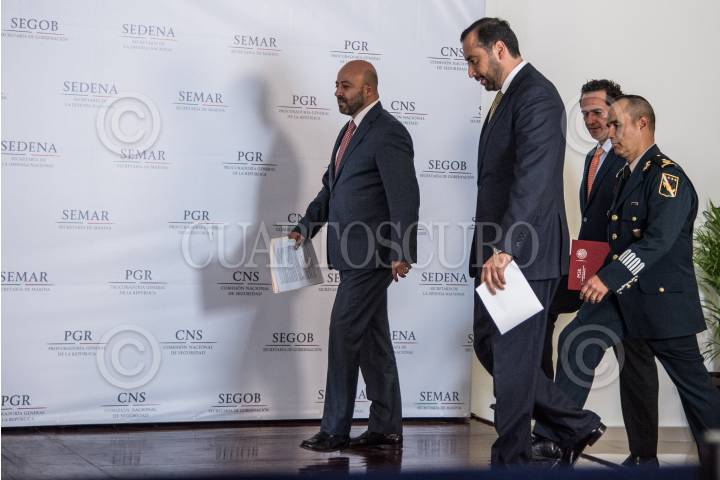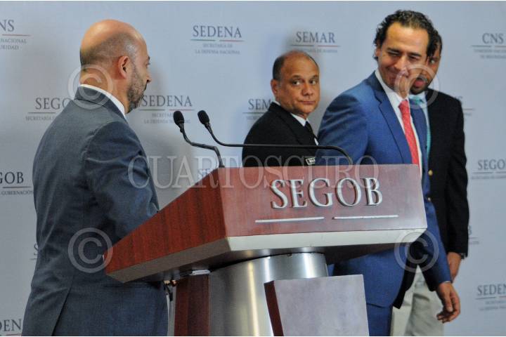 CIUDAD DE MÉXICO, 01FEBRERO2018.- Alfonso Navarrete Prida, secretario de Gobernación, encabezó una conferencia de prensa, lo acompañaron Renato Sales, Comisionado Nacional de Seguridad; Alberto Elías Beltrán, subprocurador jurídico de Asuntos Internacionales y encargado de despacho de al PGR, y Manelich Castilla Craviotto, comisionado General de la Policía Federal. El encargado de la política interior del país ofreció un balance sobre los resultados del operativo encabezado por las fuerzas federales en varios estados del país, puntualizó que a una semana de su aplicación en los mismos no se han reportado homicidios relacionados con el crimen organizado. FOTO: MOISÉS PABLO /CUARTOSCURO.COM