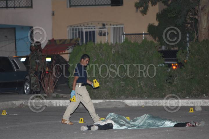 CUIDAD JUÁREZ, CHIHUAHUA, 03JUNIO2009.- Los cuerpos sin vida de Erick Arturo Rentería, de 19 años y Julián Salas Menchaca, de quedaron tendidos en el piso luego de ser acribillados en las calles Paseo de la Plaza y Del Portal, del Fraccionamiento Villa Colonial; mientras que horas mas tarde murió Carlos Chacón Gutiérrez, de 19 en la clínica Star Medica cuando recibía atención medica luego de haber sido lesionado en el mismo incidente; en la escena del crimen se aseguraron 28 casquillos percutidos, calibres 7.62x39, 10 y 9 mm. FOTO: BIENINFORMADO.COM/CUARTOSCURO.COM