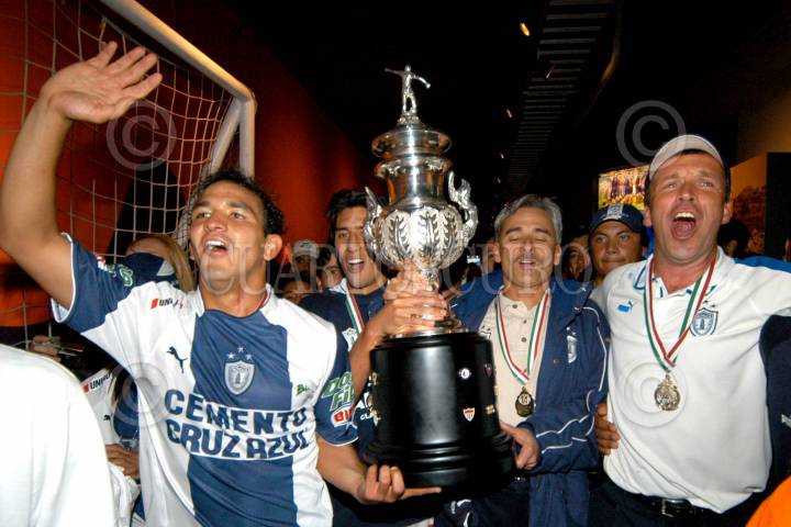 PACHUCA, HIDALGO 21MAYO2006.- Eduardo Rergis, jugador de Pachuca, el presidente del Club Pahuca, Jesús Martínez (derecha) y Andrés Fassi sostienen la copa de campeón del torneo de clausura 2006. FOTO: Carlos Guzmán/CUARTOSCURO.COM