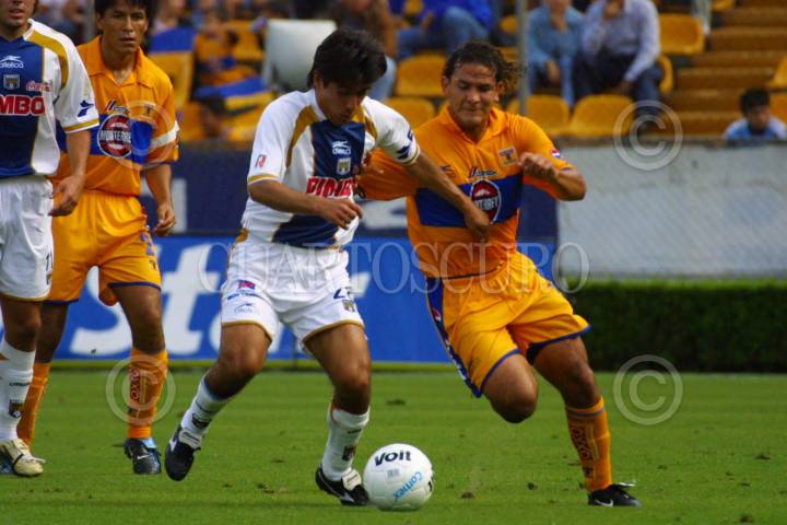 México, D.F.14MARZO2004.- Francisco Fonseca, delantero de los Pumas, se disputa la posesión de el balón con Eduardo Rergis, de los Tigres de la UANL, en el encuentro disputado en el estadio Olímpico del 68, correspondiente a la fecha 10 del torneo de Clausura. Los Pumas se impusieron con marcador de 2-1. FOTO:Moisés Pablo/CUARTOSCURO.COM