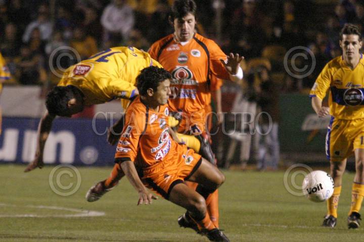 Monterrey, N.L. Mexico 1 de mayo de 2004.- Eduardo Rergis jugador de Tigres y Arturo Olvera jugador de San Luis, disputan el balon durante el juego correspondiente a la jornada 17 del Torneo Clausura 2004. partido realizado en el estadio Universitario. FOTO: Jorge López/CUARTOSCURO.COM