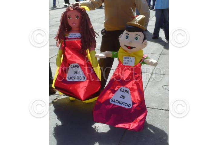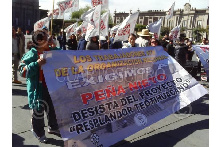 TOLUCA, ESTADO DE MÉXICO, 21ENERO2009.- Integrantes del sindicato del INAH se manifestaron frente al palacio de gobierno para exigir que se detengan los trabajos del espectáculo multimedia "Resplandor Teotihuacano" y que actualmente se sigue instalando en la zona arqueológica de las Pirámides del Sol y Luna en Teotihuacán. FOTO: MARIO NULO/CUARTOSCURO.COM