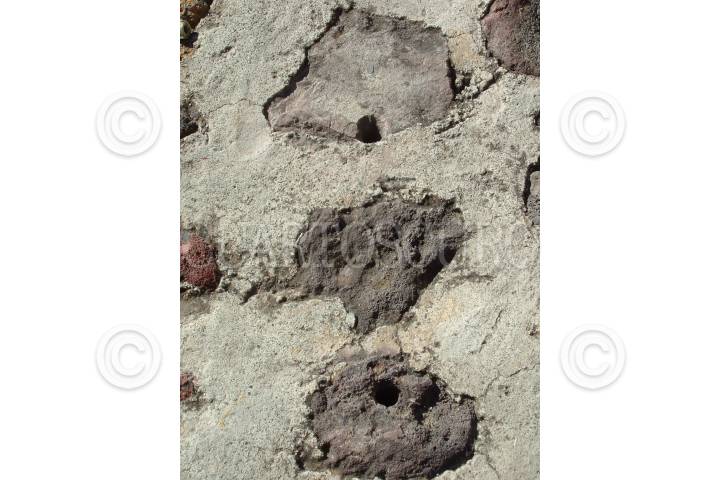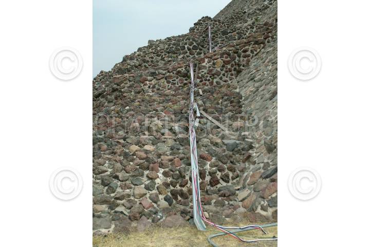 TEOTIHUACÁN, ESTADO DE MÉXICO, 24ENERO2009.- En la pirámide de "El Sol" en la zona arqueológica de Teotihuacán, permanecen los agujeros que se hicieron para introducir los taquetes y tornillos para asegurar las luminarias que forman parte del proyecto multimedia "Resplandor Teotihucano". También quedan residuos los cuales serían desalojados según recomendación de diputados federales que hace unas semanas llevaron una inspección por el lugar. FOTO: MARIO NULO/CUARTOSCURO.COM