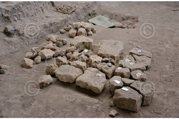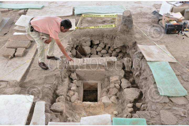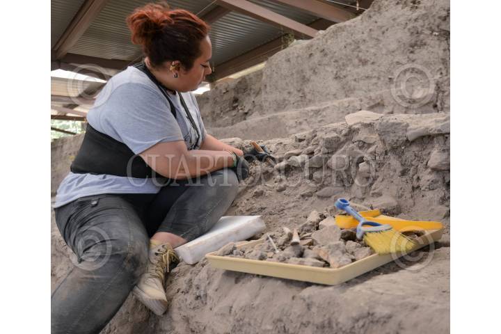 Proceso de limpieza de vestigios descubiertos durante la supervisión de los trabajos de construcción de la calzada peatonal Chivatito