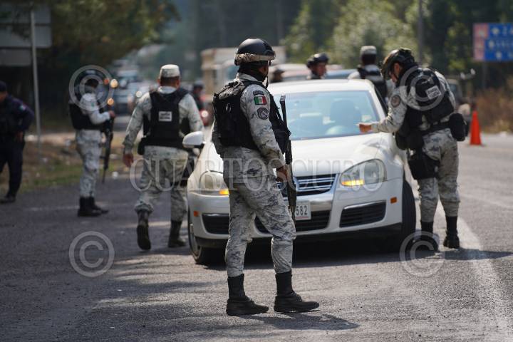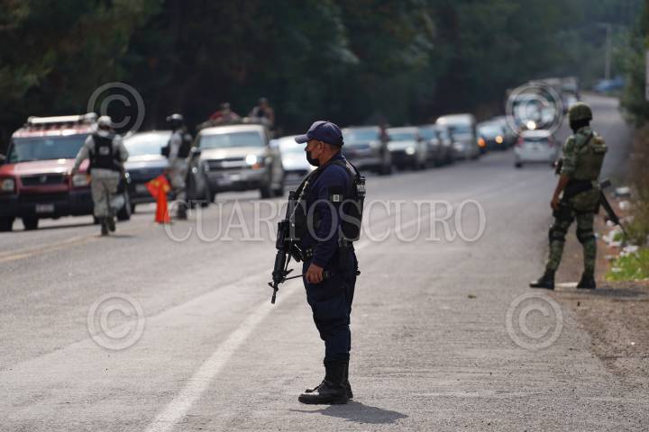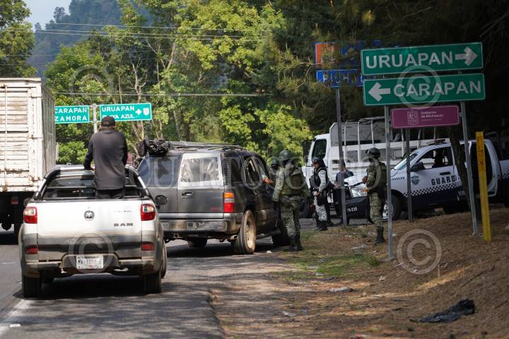 Elementos de la Guardia Nacional establecen un reten de revisión en la entrada de Uruapan donde la percepción de inseguridad es del 86.5 por ciento, ello representa un aumento, ya que el segundo trimestre de 2022 era de 84 por ciento, de acuerdo a cifras oficiales de la Encuesta Nacional de Seguridad Pública Urbana (ENSU).