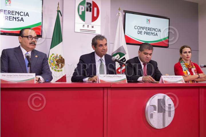 CIUDAD DE MÉXICO, 25JULIO2017.- Jorge Carlos Ramírez Marín, representante del PRI antel el INE, Enrique Ochoa Reza, presidente nacional del PRI, Miguel Ángel Riquelme, gobernador electo de Coahuila, y Carolina Viggiano, secretaria jurídica y transparencia del PRI, en conferencia de prensa donde dieron a conocer que el INE se equivocó al acusar a Miguel Ángel Riquelme de haberse sobrepasado en los gastos de su campaña electoral. FOTO: TERCERO DÍAZ /CUARTOSCURO.COM