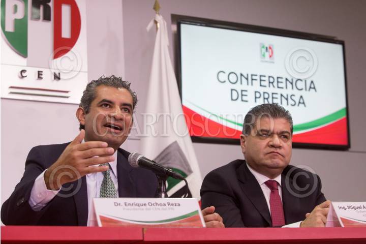 CIUDAD DE MÉXICO, 25JULIO2017.- Enrique Ochoa Reza, presidente nacional del PRI, y Miguel Ángel Riquelme, gobernador electo de Coahuila, en conferencia de prensa donde dieron a conocer que el INE se equivocó al acusar a Miguel Ángel Riquelme de haberse sobrepasado en los gastos de su campaña electoral. FOTO: TERCERO DÍAZ /CUARTOSCURO.COM