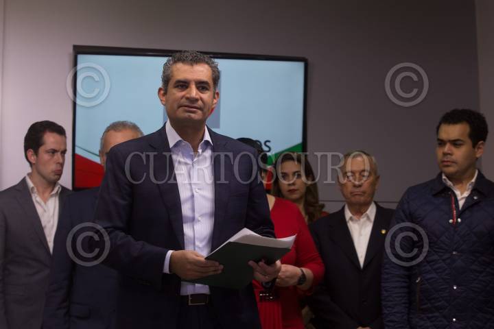 CIUDAD DE MÉXICO, 04MARZO2018.- Enrique Ochoa Reza, presidente nacional de l PRI, en compañia de varios funcionarios públicos de su partido, ofreció una conferencia de prensa para exigirle a Ricardo Anaya, candidato a la presidencia nacional por el frente conformado por el PAN, PRD y MC, a que aclare las denuncias que tiene sobre su declaración de ingresos y sus gastos elevados. FOTO: TERCERO DÍAZ /CUARTOSCURO.COM