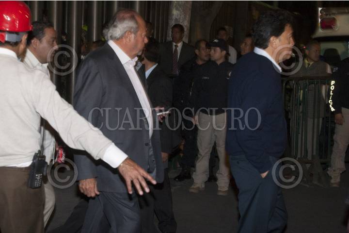 MÉXICO, D.F., 31ENERO2013.- Carlos Romero Deschamps, líder de los petroleros, y Ricardo Aldana Prieto, tesorero del sindicato petroleros, salen de la Torre de Pemex, en donde se suscitó una explosión que dejó un saldo preliminar de 25 muertos y 80 lesionados. FOTO: JUAN PABLO ZAMORA /CUARTOSCURO.COM