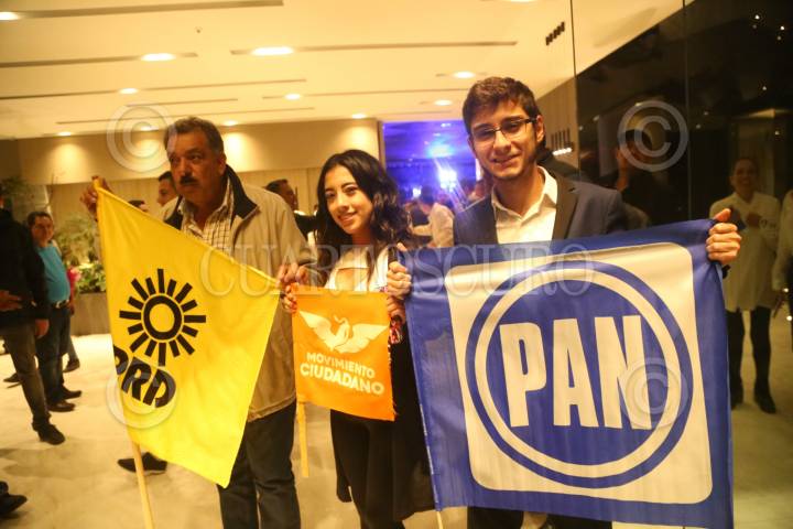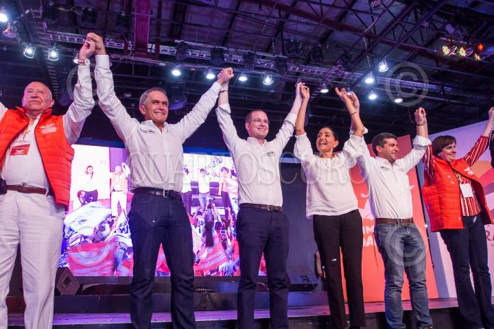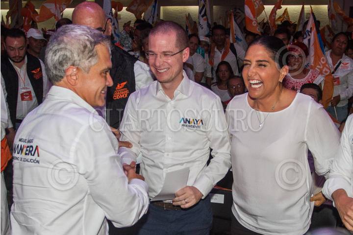 CIUDAD DE MÉXICO, 04JUNIO2018.- Ricardo Anaya y Alejandra Barrales, candidatos a la Presidencia de la República y al Gobierno de la Ciudad de México, por la Alianza Por México al Frente, encabezaron una reunión con militantes del Partido Movimiento Ciudadano, durante la cual los acompaño Miguel Ángel Mancera, ex jefe de Gobierno y candidato al Senado de la República. FOTO: ISAAC ESQUIVEL /CUARTOSCURO.COM