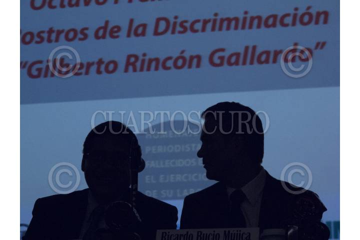 MÉXICO, D.F., 30AGOSTO2012.- Luis Gónzalez Plascencia, presidente de la Comisión de Derechos Humanos del DF, y Ricardo Bucio Mujíca, presidente de la Comisión Nacional para Prevención la Discriminación, encabezaron la entrega de los premios del Octavo Premio Nacional de Rostros de la Discriminación "Gilberto Rincón Gallardo", que se realizó en el Museo de la Tolerancia. FOTO: MOISÉS PABLO /CUARTOSCURO.COM