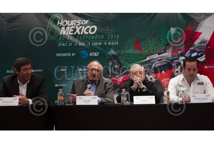 CIUDAD DE MÉXICO, 13MARZO2016.- Gerard Neveu, CEO FIA World Endurance Championship; José Abed, vicepresidente mundial de la Federación Internacional de Automovilismo (FIA); Jean Todt, presidente de la Federación Internacional de Automovilismo (FIA), y el piloto Ricardo González, durante la presentación de las "6 Horas de México", que se realizarán el 2 y 3 de septiembre de 2016 en el Autódromo Hermanos Rodríguez, la cual es parte del Campeonato Mundial de Resistencia (WEC, por sus siglas en inglés). FOTO: MOISÉS PABLO /CUARTOSCURO.COM