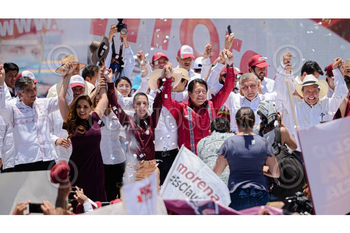 Américo Villareal, Mara Lezama, Claudia Sheinbaum, Mario Delgado, Adán Augusto López, y Ricardo Morenal, durante una asamblea informativa en Torreón, Coahuila, con miras a las elecciones que se llevarán a cabo en este estado el próximo año.