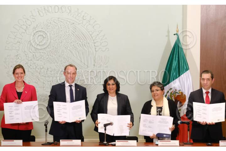 CIUDAD DE MÉXICO, 08AGOSTO2019.- Julián Ventura, subsecretario de Relaciones Exteriores; Graciela Márquez, secretaria de Economía; Corin Robertson, embajadora de Reino Unido en México; Dominic Raab, secretario de Estado para Asuntos Exteriores y de la Mancomunidad del Reino Unido de la Gran Bretaña e Irlanda del Norte; Irma Erendira Sandoval, secretaria de Función Pública; Raquel Buenrostro Sánchez, Oficial Mayor de la Secretaria de Hacienda y Crédito Público (SHCP), y Ricardo Salgado Perrilliat, secretario técnico de la Secretaría Ejecutiva del Sistema Nacional de Anticorrupcion, durante la Firma de un Memorándum de entendimiento en materia de Gobierno Digital, el cual se realizó en la Sala de Usos Múltiples de la SHCP, en Palacio Nacional. FOTO: GRACIELA LÓPEZ /CUARTOSCURO.COM