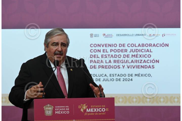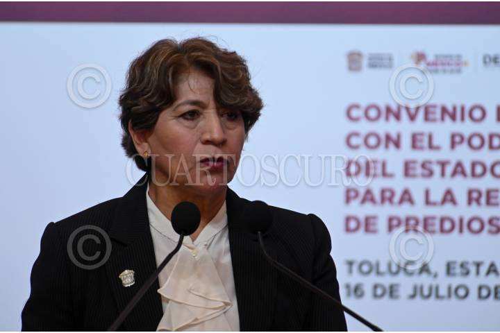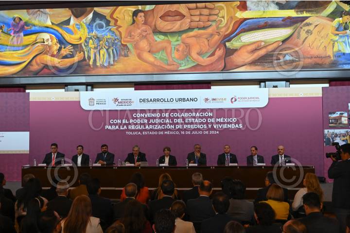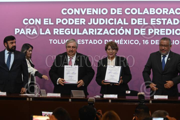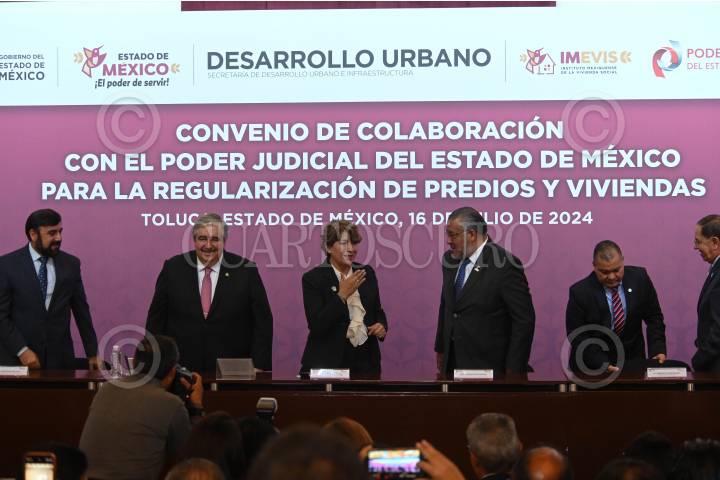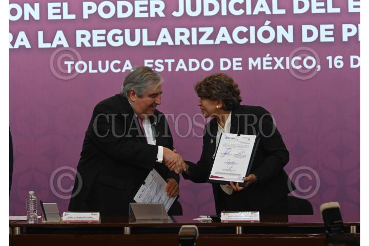 TOLUCA, ESTADO DE MÉXICO, 16JULIO2024.- Delfina Gómez Álvarez, Gobernadora del Estado de México y Ricardo Sodi Cuéllar Magistrado Presidente del Poder Judicial del Estado de México firmaron el Convenio de Colaboración para la Regularización de Predios y Viviendas. FOTO: CRISANTA ESPINOSA AGUILAR /CUARTOSCURO.COM