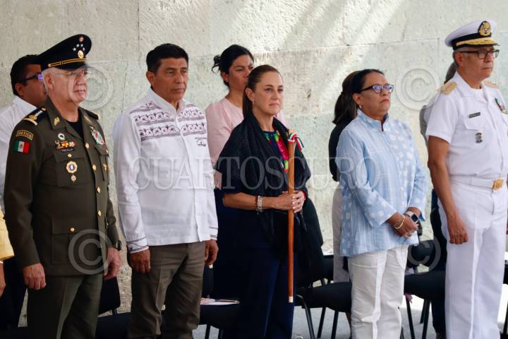 GUELATAO DE JUÁREZ, OAXACA, 21MARZO2025.- Ricardo Trevilla Trejo, secretario de la Defensa Nacional; Salomón Jara, gobernador de Oaxaca; la presidenta de la República Claudia Sheinbaum Pardo; Rosa Icela Rodríguez, secretaria de Gobernación, y Raymundo Pedro Morales, secretario de Marina, durante el homenaje por el 219 aniversario del natalicio de Benito Juárez en la comunidad serrana de Guelatao de Juárez, Oaxaca. FOTO: CAROLINA JIMÉNEZ/CUARTOSCURO.COM